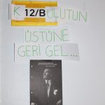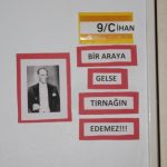 Anadolu Lisesi Onur Kurulunun planladığı “Atatürk Sınıflarımızda Yaşıyor” konulu etkinlik öğrencilerimizin gönüllü katılımıyla Ata sevgisinin kapı isimliklerine nakış gibi işlendiği güzel bir faaliyete dönüştü. Sınıf isimlikleri hiç bu kadar anlamlı ve güzel görünmemişti gözümüze. Gençler, sınıf kapılarında yer alan sınıf isimliklerini Atatürk sevgisini de kapsayıcı anlamlı bir cümlenin parçası yaptılar.