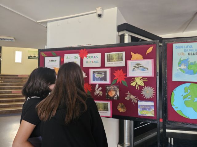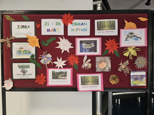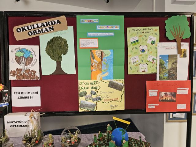 Sosyal Bilgiler Zümresi, Turizm, Gezi ve Çevre Kulübü ile UNESCO Kulübü öğrencilerinin iş birliğiyle, çevresel sürdürülebilirlik konusunda farkındalık oluşturmak amacıyla Orman Haftası panoları hazırlandı.