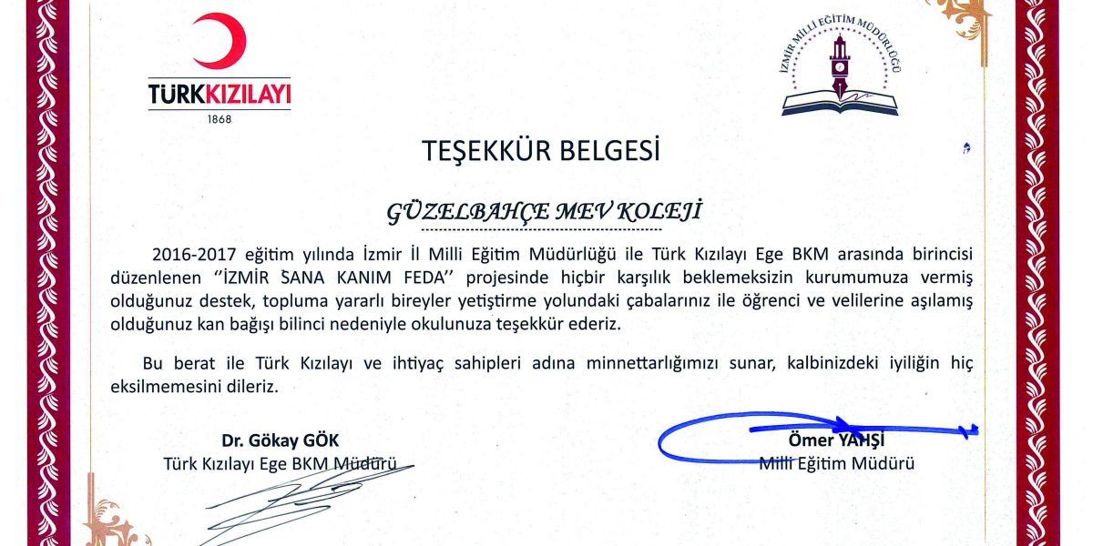 Sosyal sorumluluk projelerimizi de dahil ettiğimiz 18 Mayıs “Dostluk Günü”nde velilerimiz, idarecilerimiz ve öğretmenlerimiz Kızılayın “Kan Ver, Can Ver” standında kan vererek farklı sağlık sorunları sebebiyle kan bekleyen birçok hastaya can olmuştu. Öğrencilerimizin ve öğretmenlerimizin bu anlamlı çabasını takdir eden İzmir Milli Eğitim Müdürlüğü ve Türk Kızılayı okulumuz adına teşekkür belgesi gönderdi.