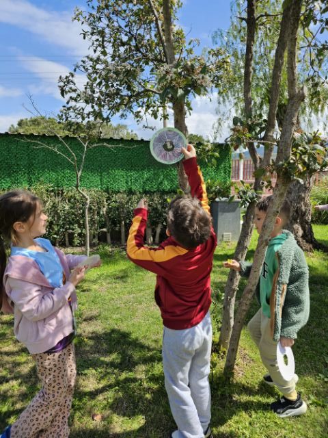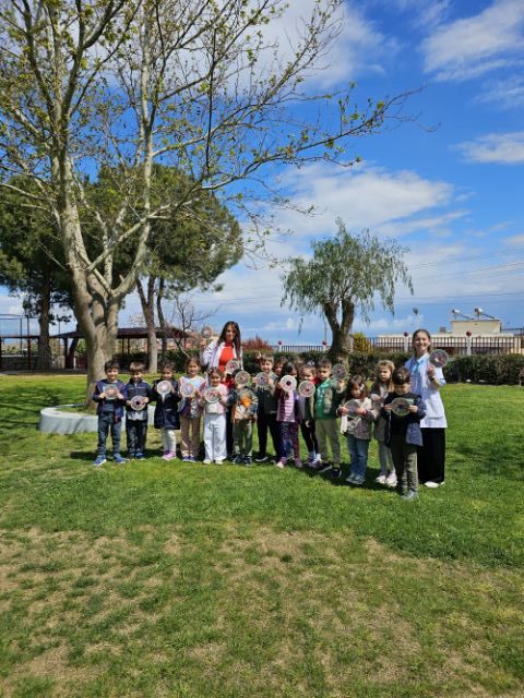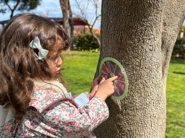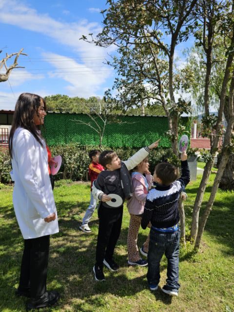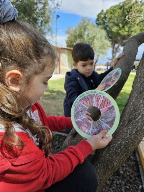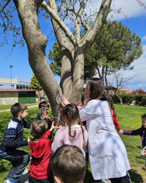 Okul bahçemizde “ağaç kabuğu gözlem çarkı” ile ağaçları yakından inceledik; kabukların dokularını, gövdelerin özelliklerini ve yaprakların farklılıklarını keşfettik. Minik öğrencilerimiz doğayı tanımanın heyecanını yaşadı.